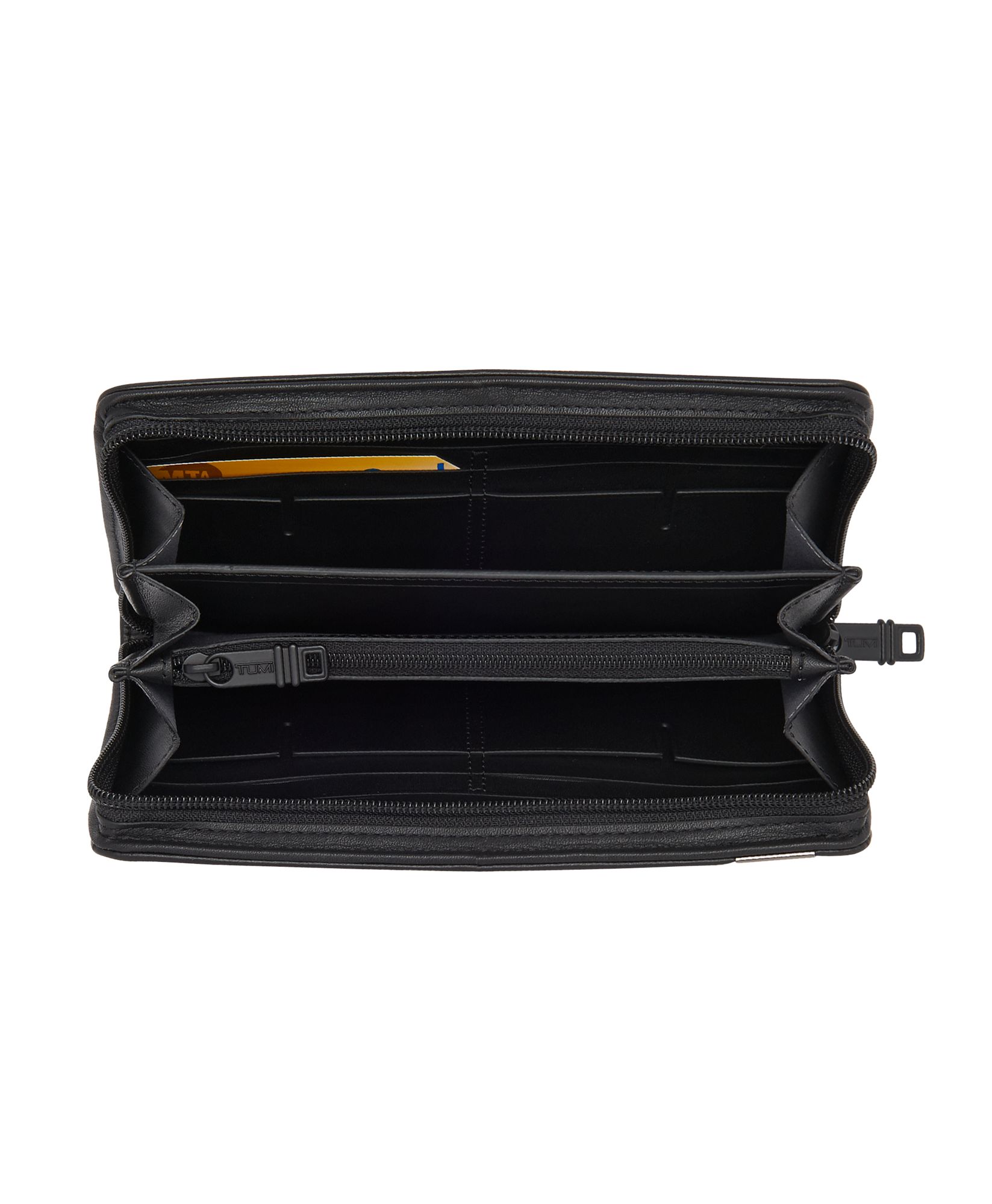 Mantenha os seus documentos de viagem seguros e sempre à mão com esta carteira larga com fecho de correr. Com vários compartimentos para guardar os seus cartões de crédito, documentos de identificação e dinheiro. Elaborada com tecido nylon balístico e acabamentos em pele característicos da coleção Tumi Alpha.