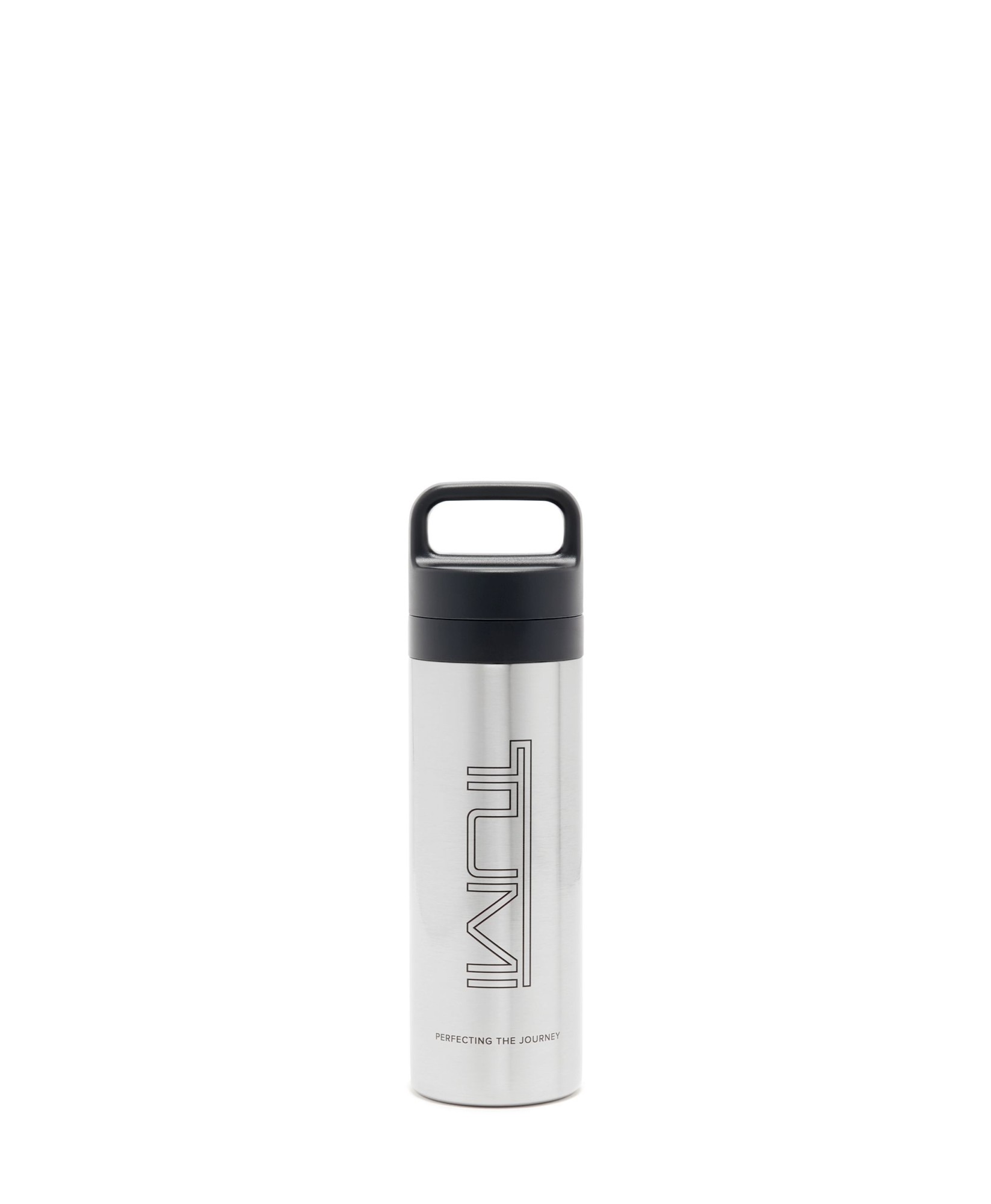 A TUMI concebeu uma garrafa de água em aço inoxidável com uma tampa de pega superior e um rebordo de boca larga para beber facilmente em viagem. A garrafa isolada a vácuo também pode manter as bebidas quentes ou frias até seis horas.