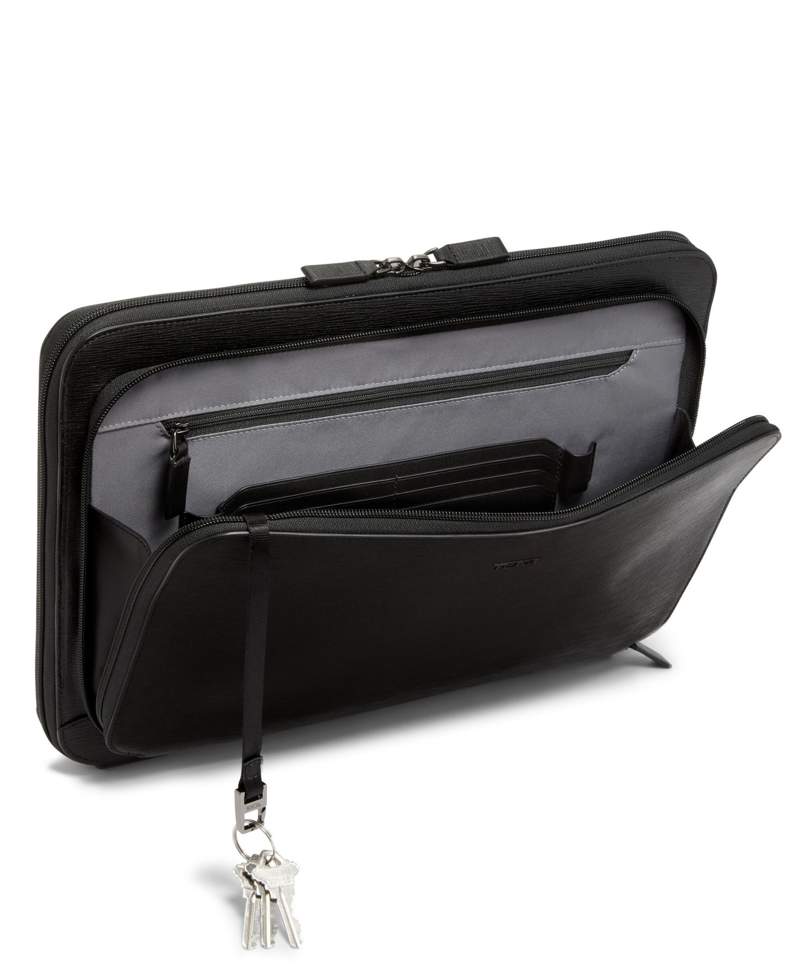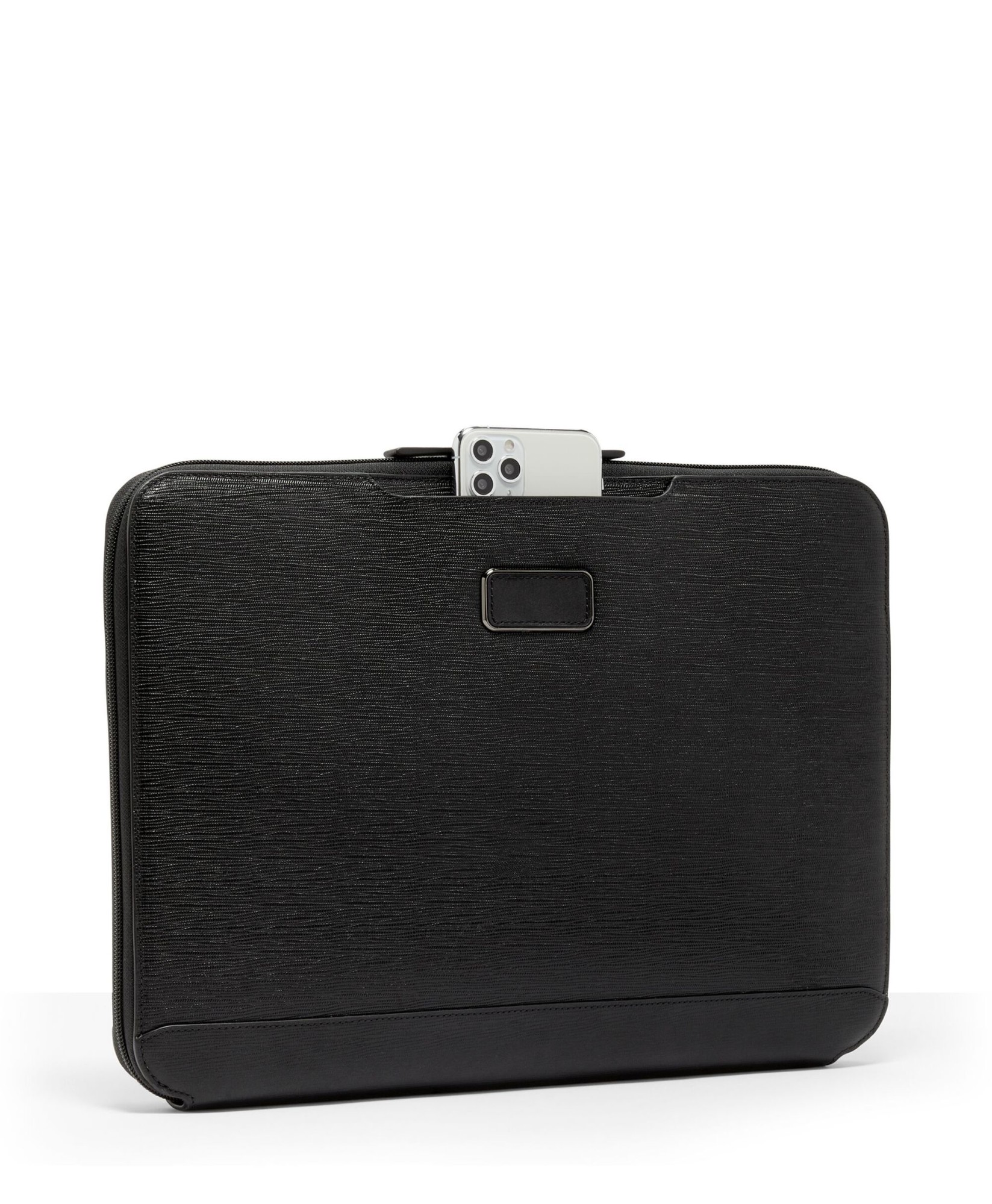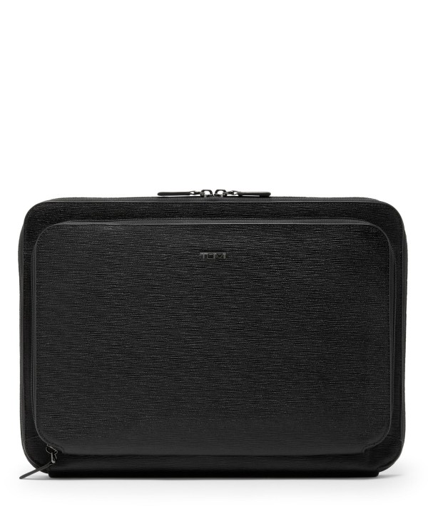 Cuidadosamente concebida para transportar um computador portátil de 14" com bolsos funcionais para arrumação adicional, esta capa para portátil em pele é uma forma elegante de transportar documentos e tecnologia em movimento.