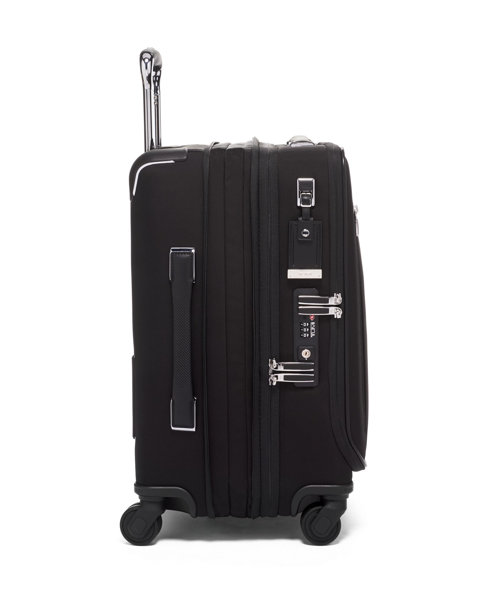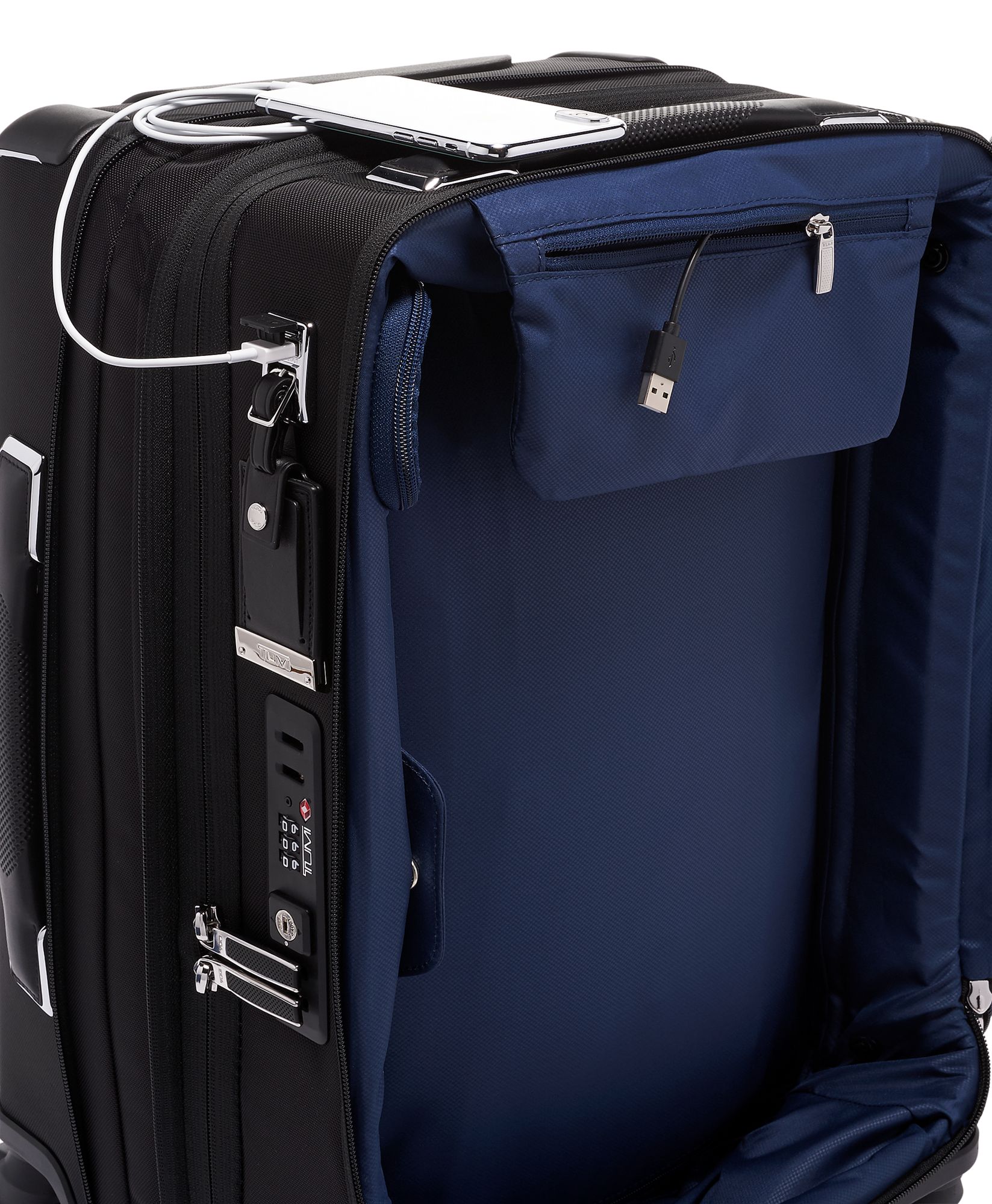 Abertura central em 2 compartimentos; Bolso frontal c/ acesso ao interior; Bolso frontal c/ fecho; Função expansível; Pegas superior e lateral retráteis em pele. Pega inferior; Pega telescópica com 3 posições de altura; 4 Rodas duplas giratórias 360º; Pára-choques para proteção; Porta-USB; 2 Fechaduras de combinação c/ fechadura TSA integrada; Etiqueta de identificação magnética; TUMI Tracer®.