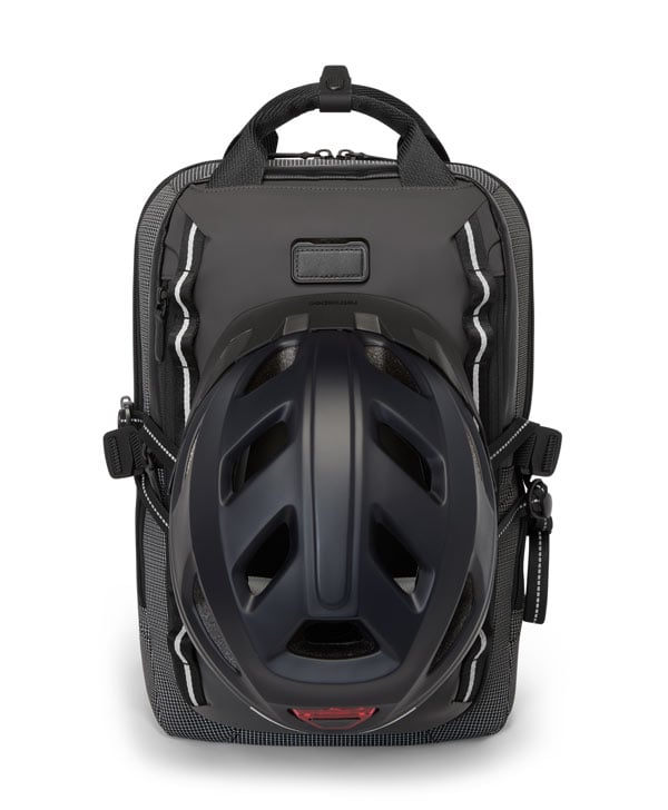 Bolso para garrafa de água resistente à água; Bolso aberto resistente à água; Bolso com fecho de correr em rede; Bolso com fecho de correr com forro resistente à água para mochila de hidratação*; Bolso acolchoado para tablet; Argola com fivela de libertação lateral para prender o cadeado da bicicleta; Suporte para chaves; TUMI Tracer®. *Mochila de hidratação e luz para bicicleta não incluídas