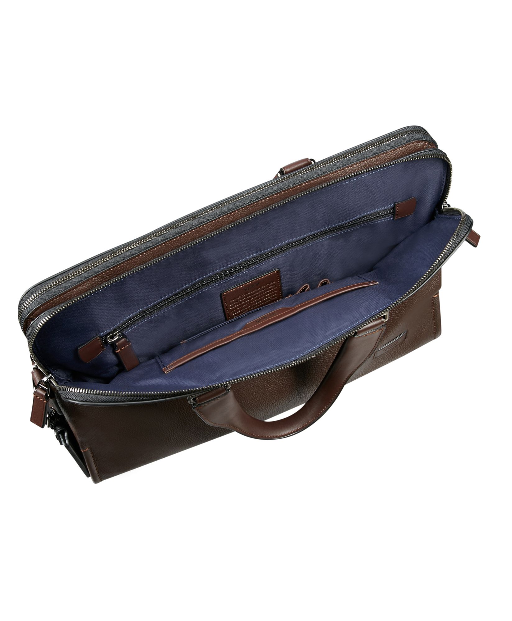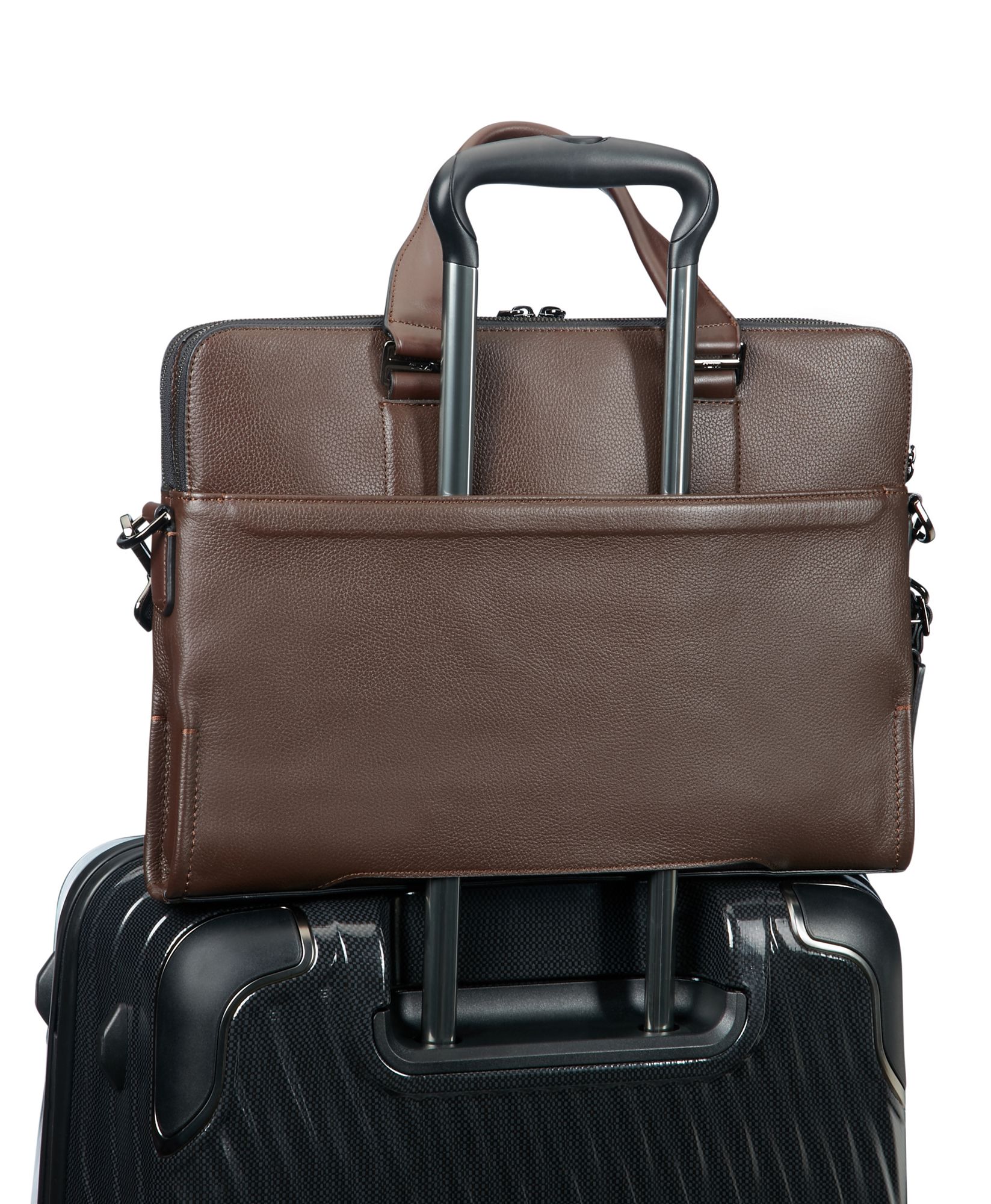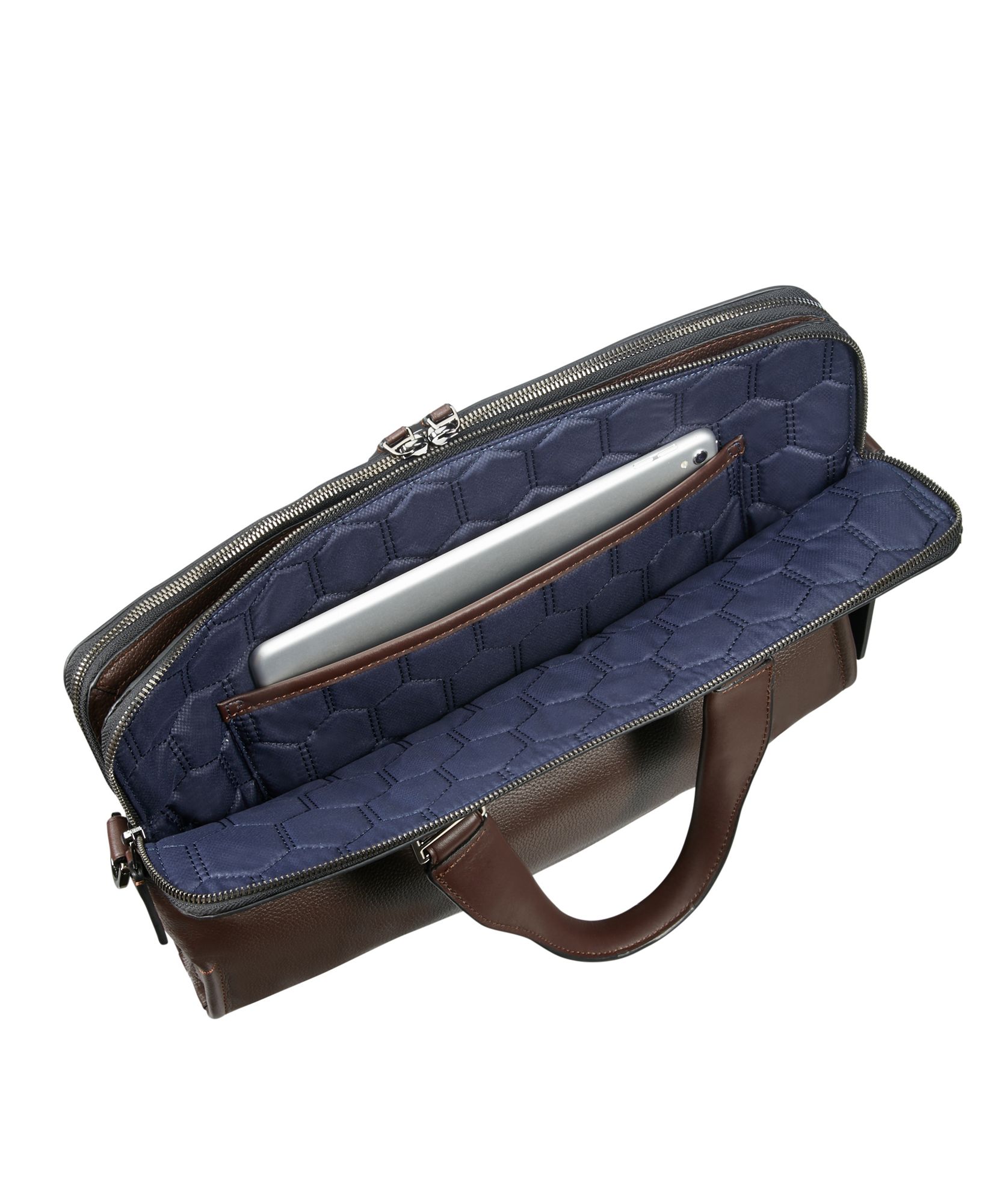 Uma pasta elegante em pele, que define o estilo urbano de quem está sempre em movimento. Parte da coleção Harrison, que possui uma sofisticada gama de bolsas e acessórios para o dia a dia, altamente projetada, com design contemporâneo e moderno. Dispõe de um fecho de correr duplo e de um amplo espaço para organizar o computador portátil, o iPad e os outros itens essenciais para o seu dia, facilitando as suas viagens pendulares.