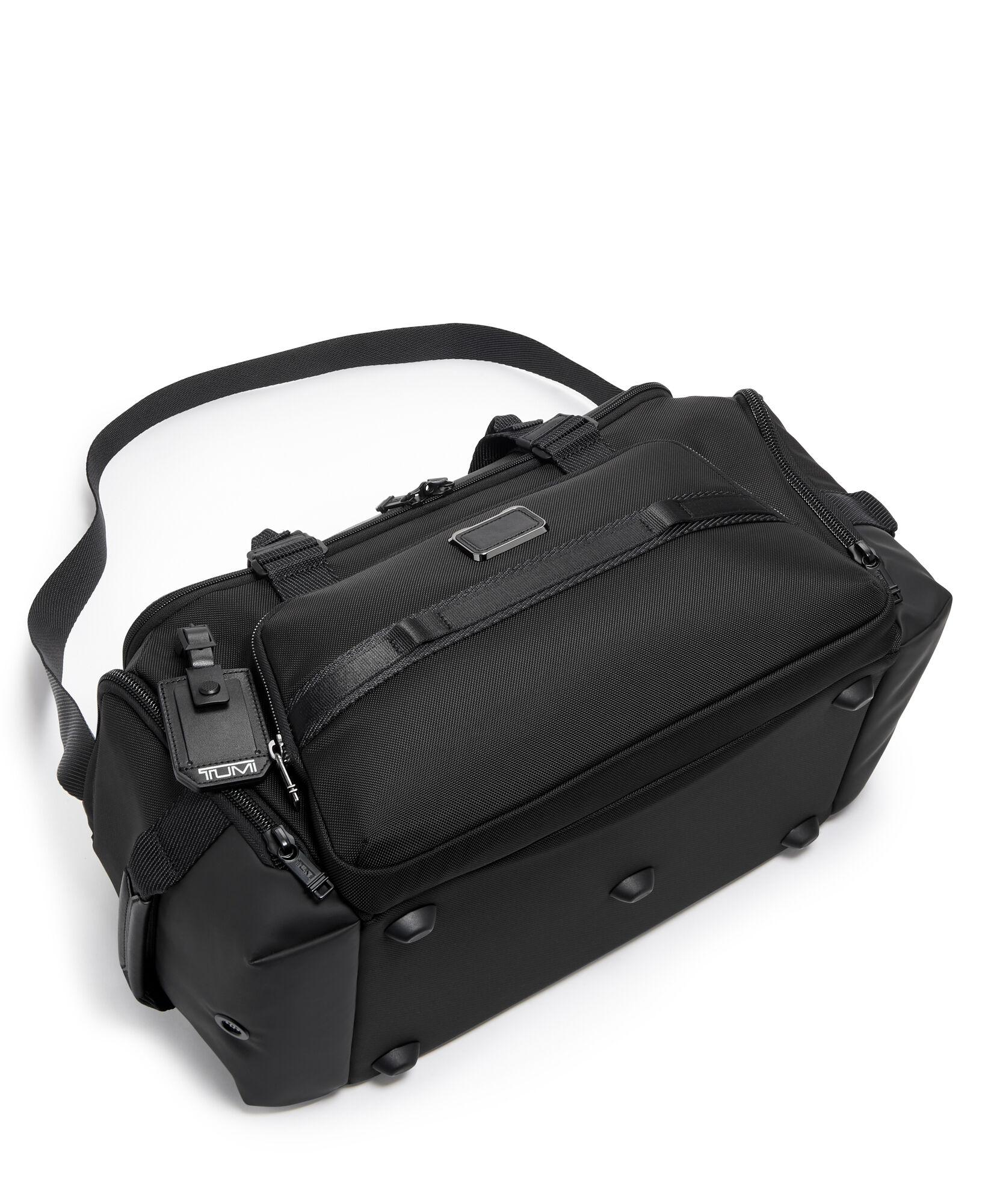 Com dois bolsos abertos; Dois bolsos para cartões; Bolso com fecho de correr; Com gancho com função porta-chaves; TUMI Tracer®.